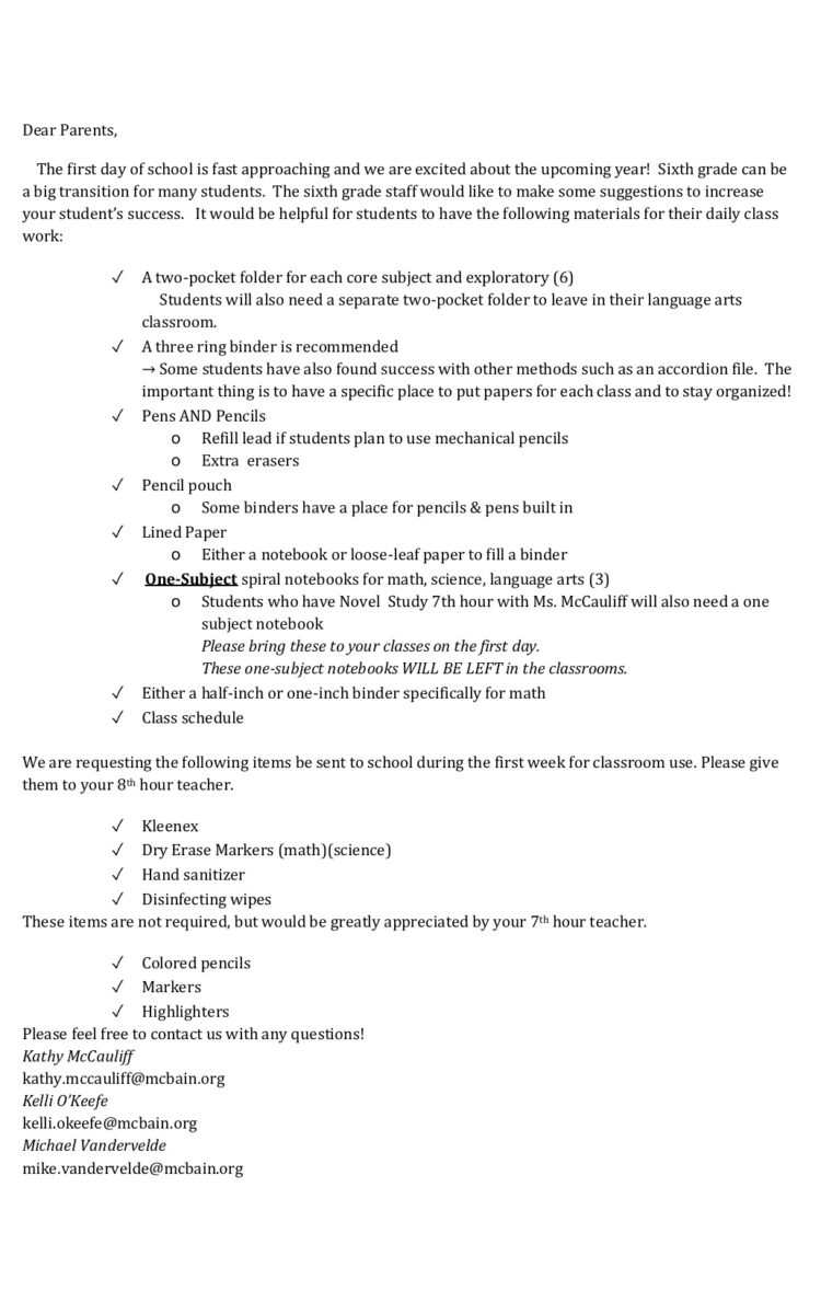 6th Grade First of the Year Letter